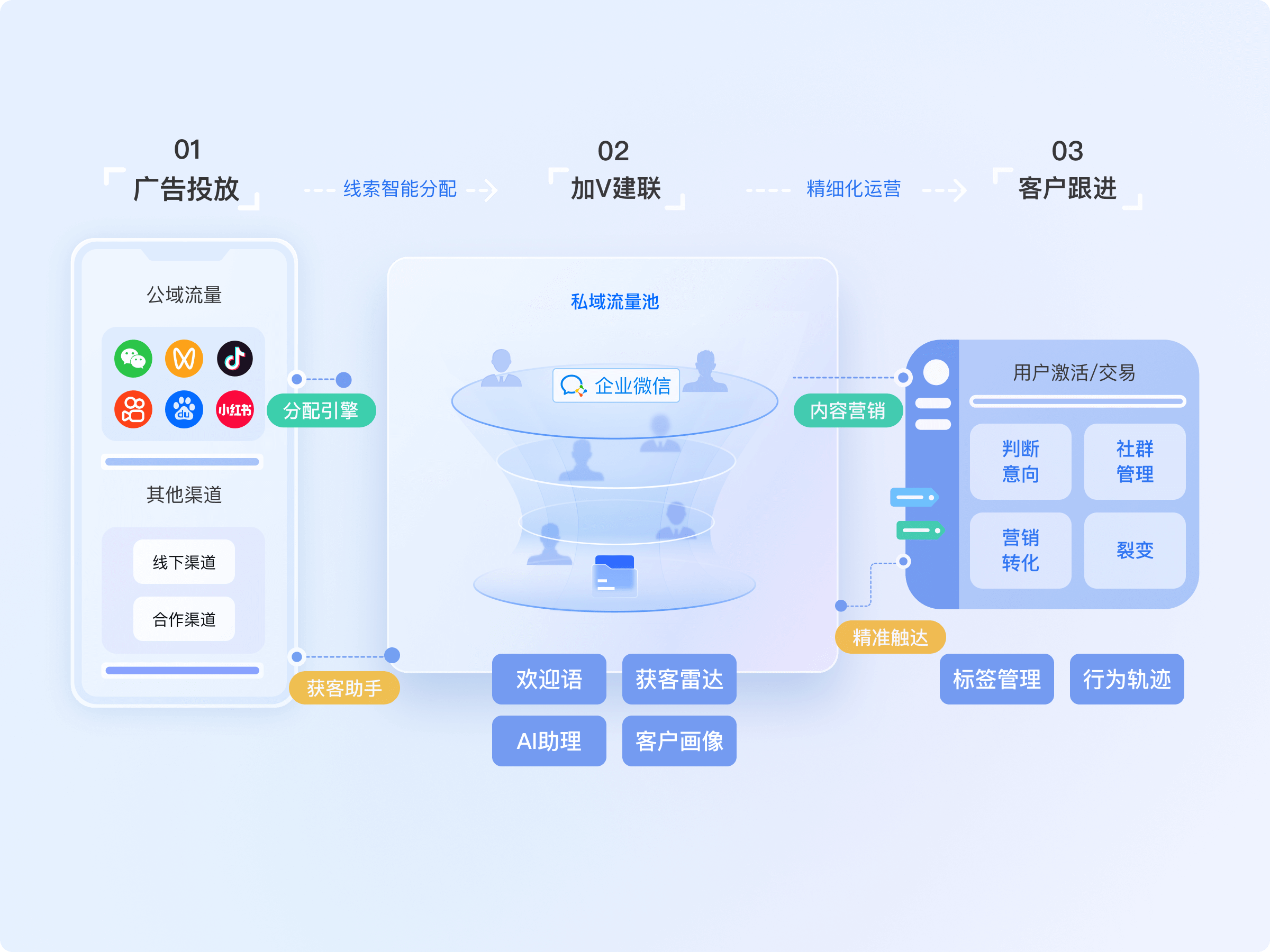打通多公域平台,多生态引流获客,多方式建联客户,提升加微率