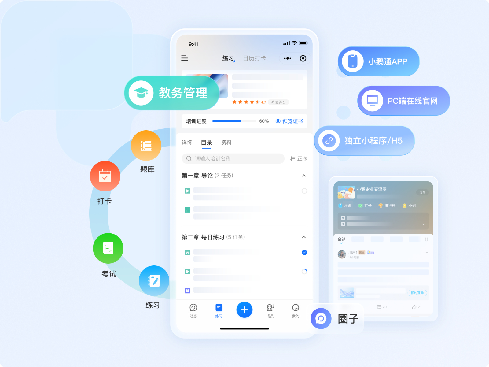 学练考一体打造完整培训闭环,快速提升培训率、复购率