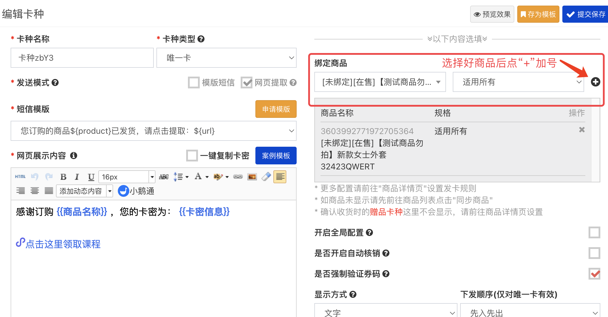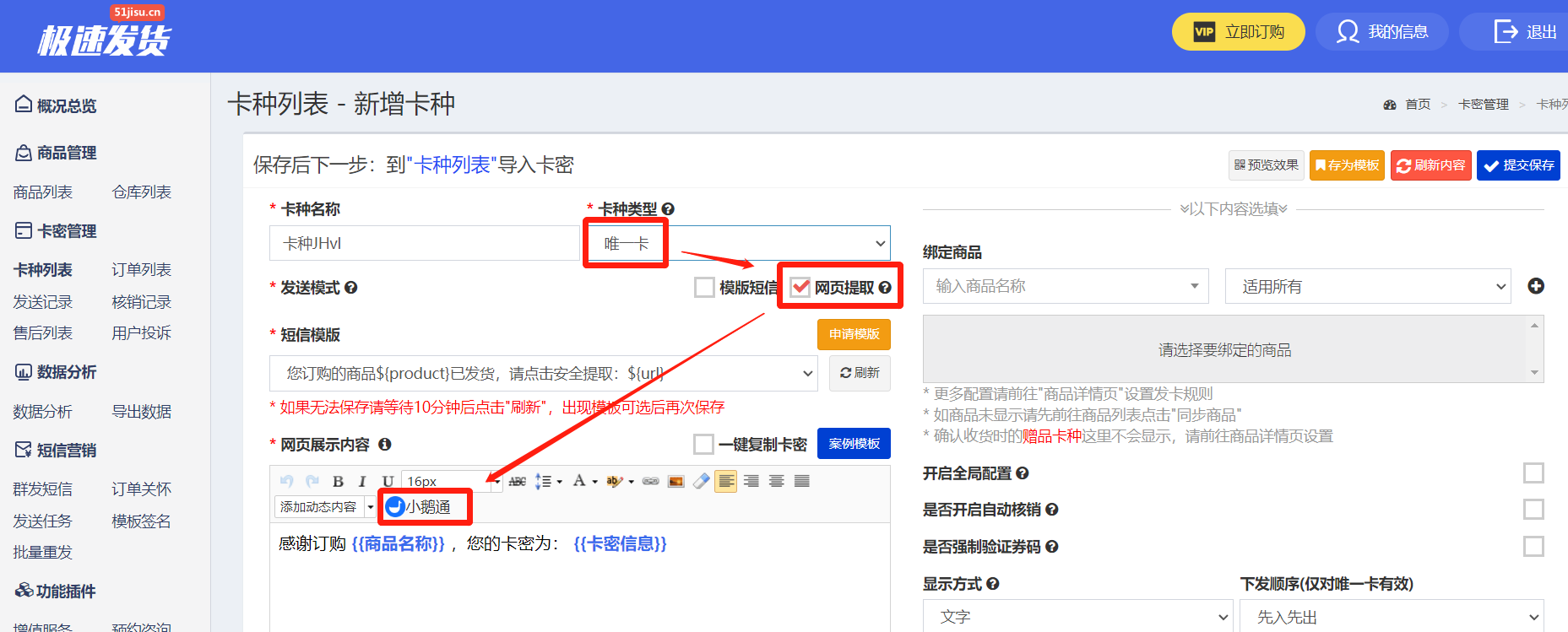 2、卡种类型选择唯一卡,发送模式选择网页提取,在网页展示内容工具栏点击小鹅通