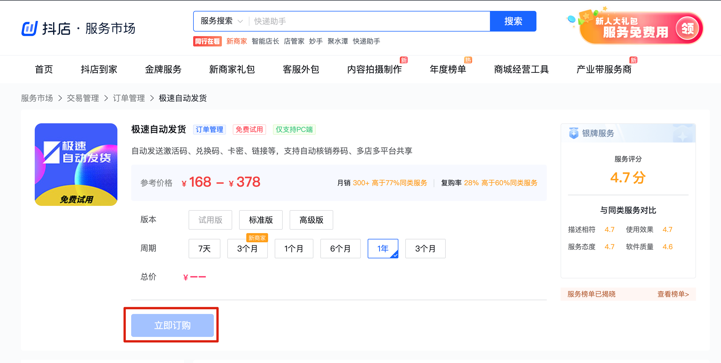 前往抖店服务市场订购服务,选择任一版本和周期
