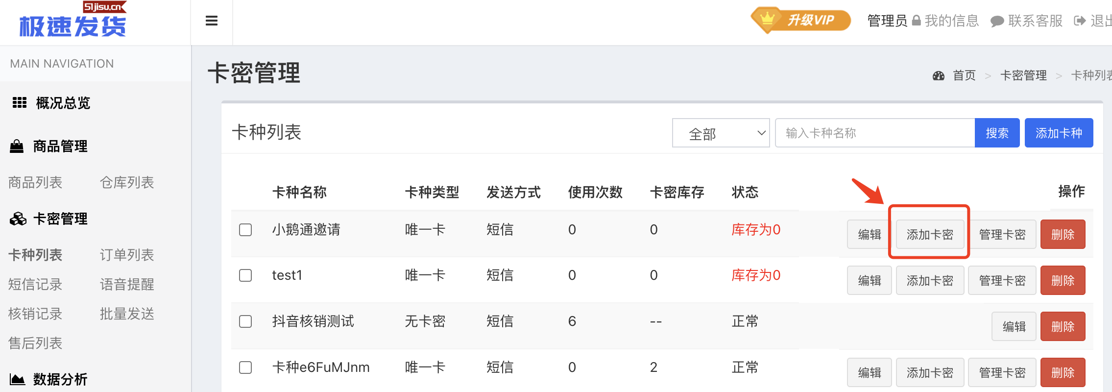 1、进入卡种列表 - 点击对应卡种操作栏的“添加卡密”