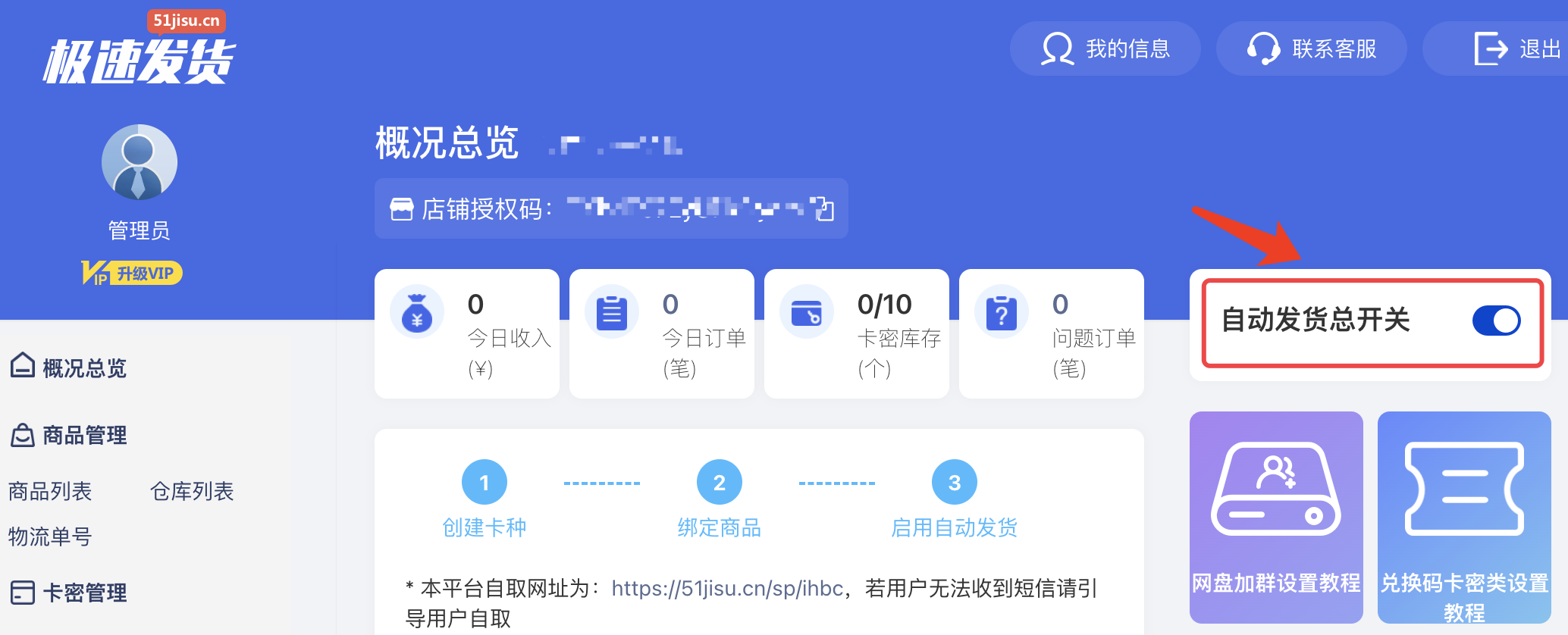 5、点击左侧导航-概况总览页,打开【自动发货总开关】
