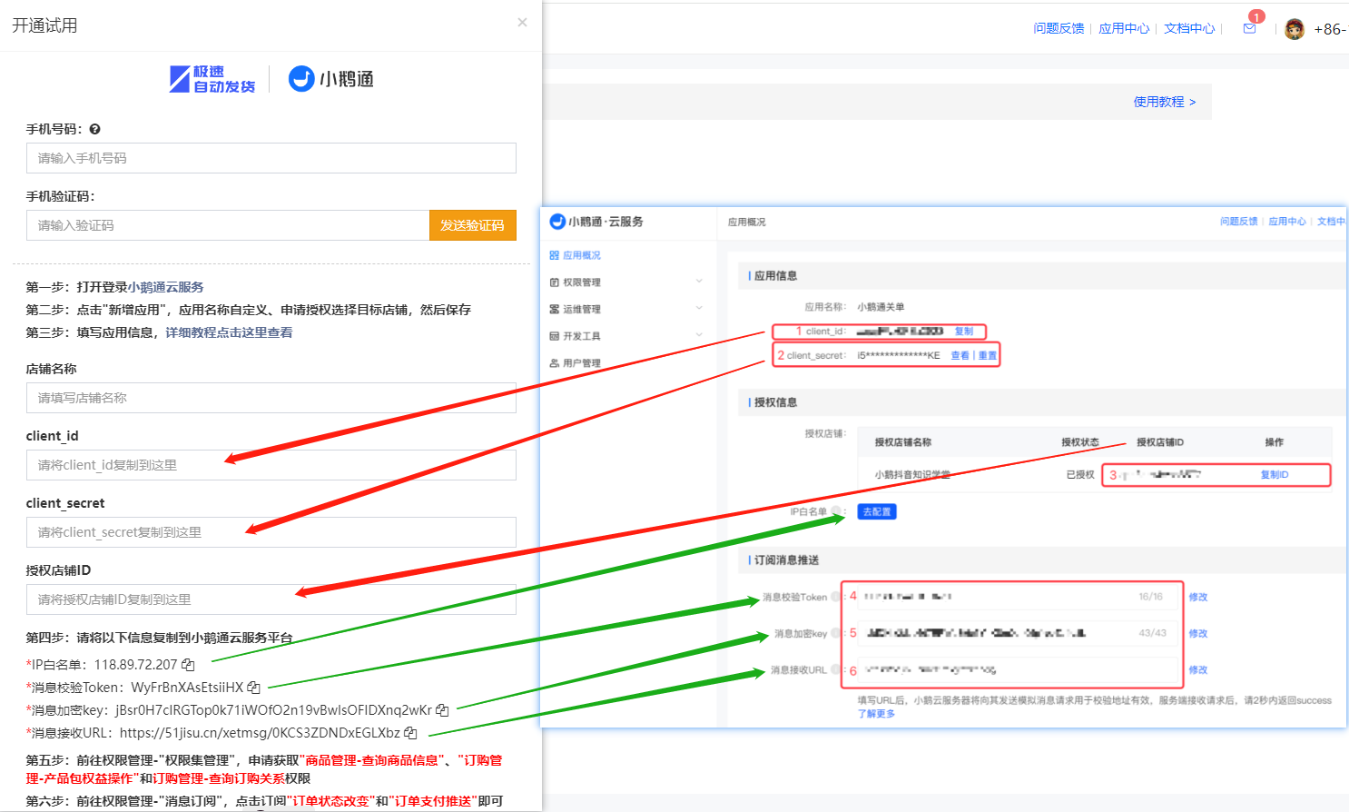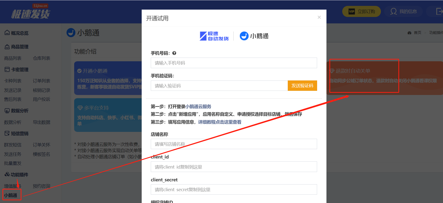 c. 在极速自动发货平台点击:功能插件-小鹅通-退款时自动关单,然后按照要求填写信息,填完信息点击【提交确认】