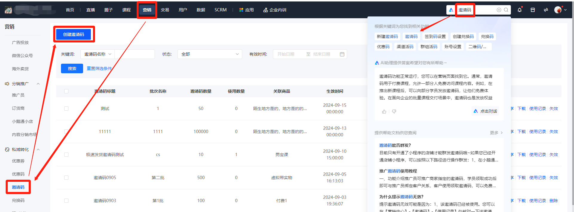 1、进入小鹅通后台,点击导航「营销-邀请码」或通过顶部搜索「邀请码」,进入邀请码页面