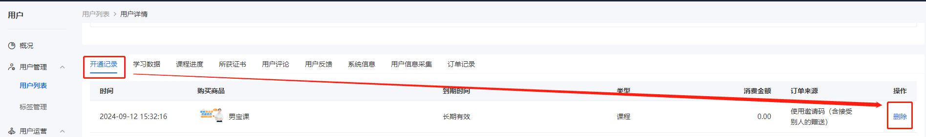 d. 进入对应用户详情-点击开通记录-点【删除】