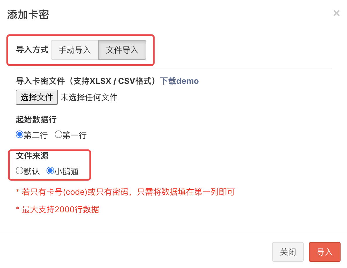 2、选择“文件导入”,起始数据行“第二行”,文件来源“小鹅通”,然后选择导入从小鹅通后台下载邀请码文件,每次最多导入2000条