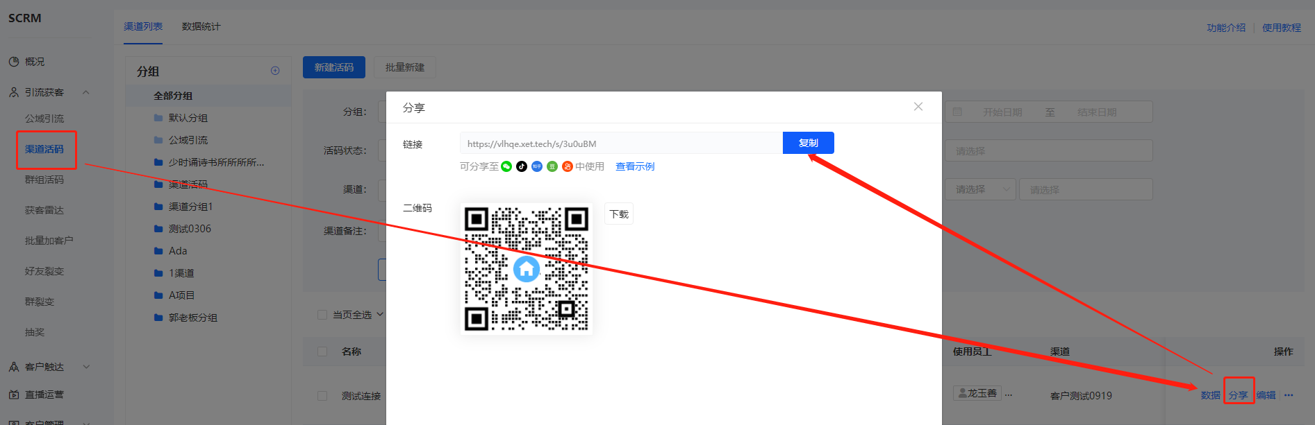 1、进入小鹅通管理台-SCRM-引流获客-渠道活码-分享-复制链接