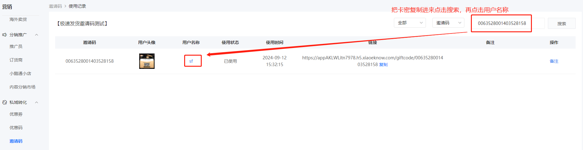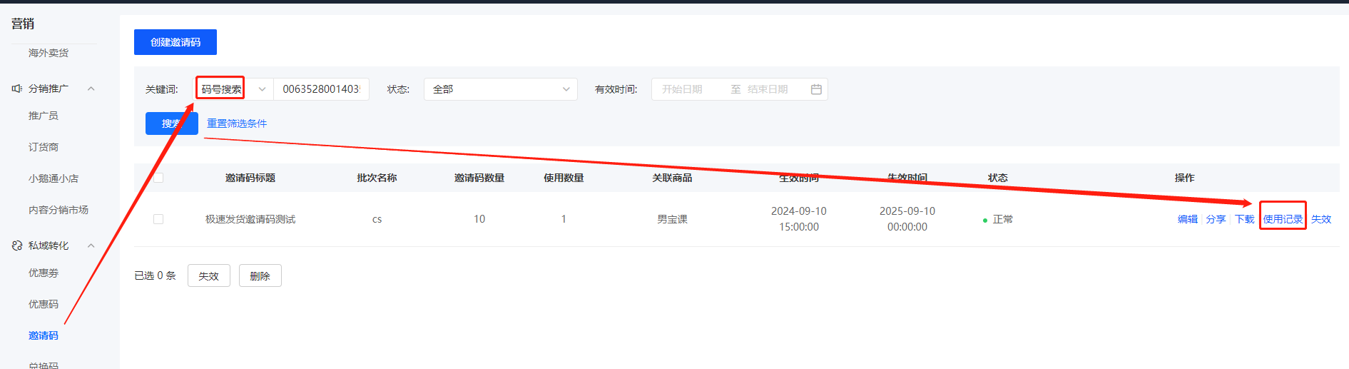 b. 进入小鹅通-邀请码列表-关键词选码号搜索,然后把前面复制的卡密粘贴至输入框-点击搜索-再点击【使用记录】