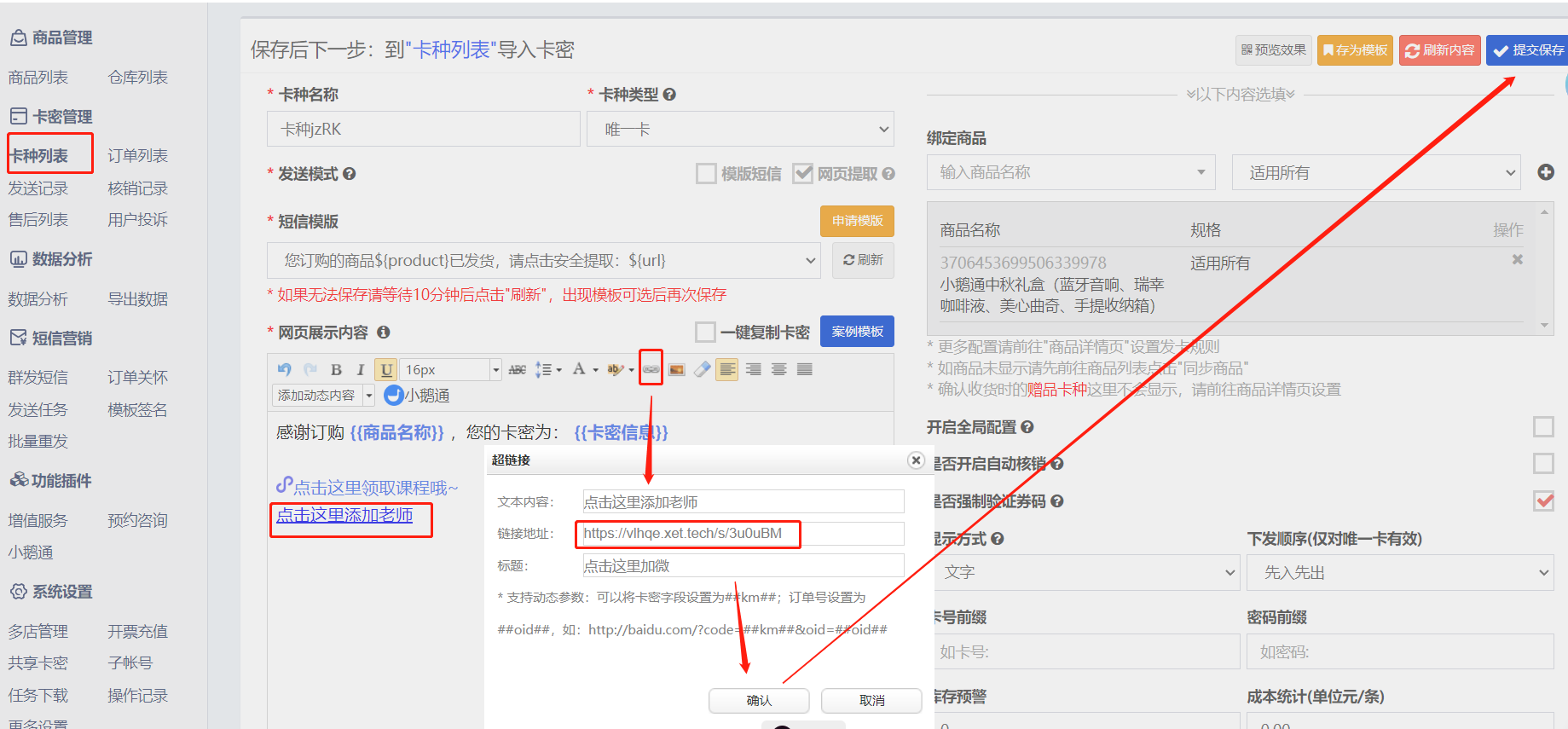 2、进入极速自动发货平台-卡种列表-编辑卡种-添加超链接,将在小鹅通复制的链接填到图中的链接地址里-点击确认-提交保存