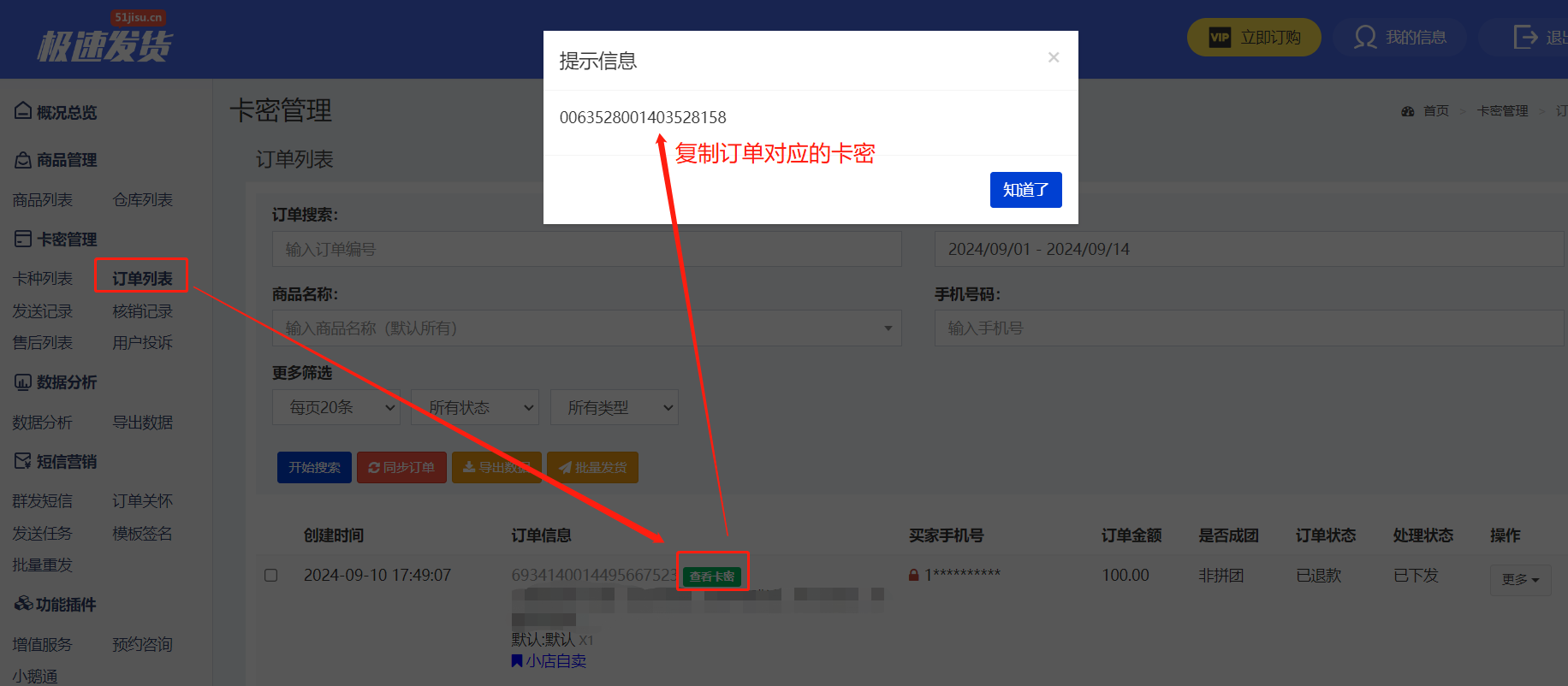 a. 进入极速自动发货平台-卡密管理-订单列表-找到已退款订单-点查看卡密,复制该卡密