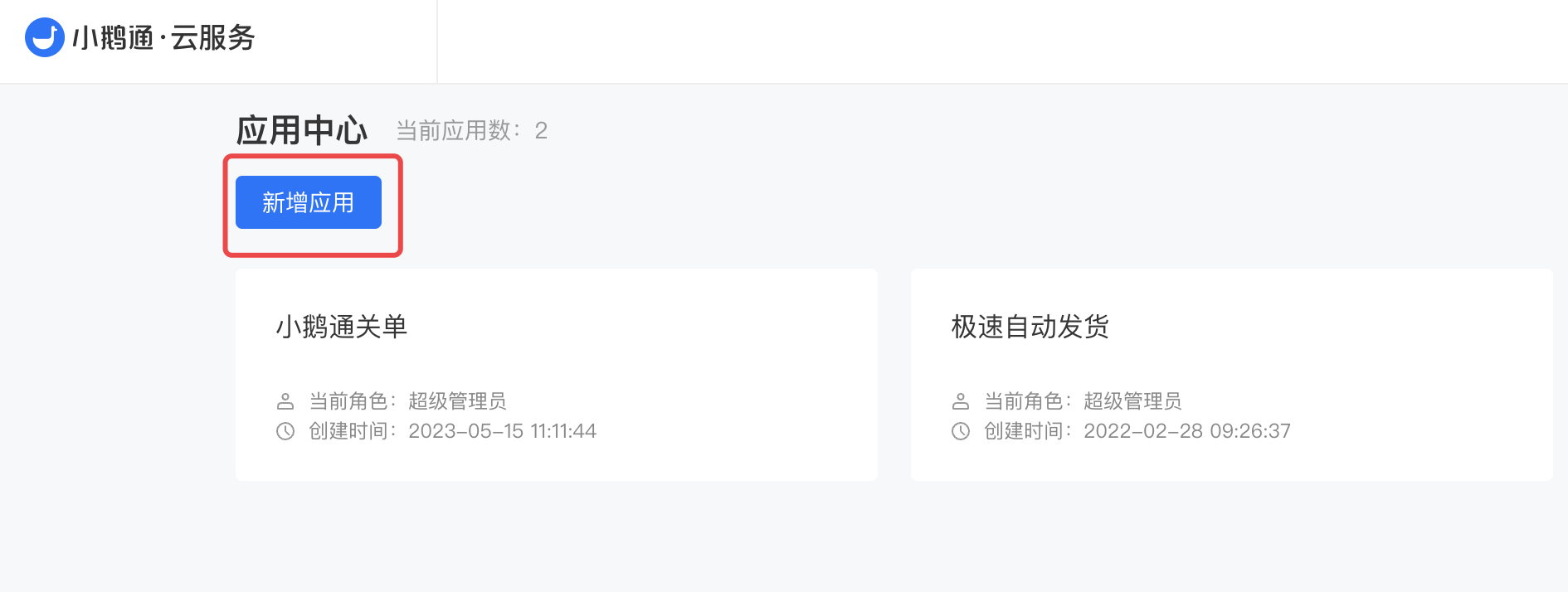 a. 使用知识店铺的账号登录小鹅通云服务平台,点击【新增应用】