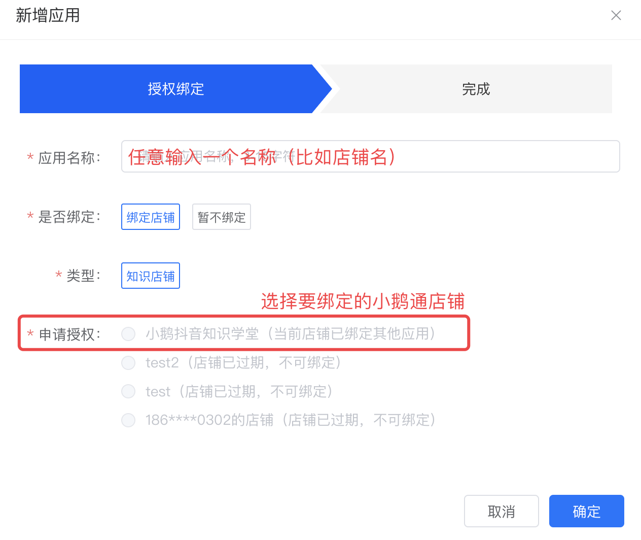 b. 按照要求填写应用名称,选择要绑定的店铺(一个店铺只能绑定一个应用)