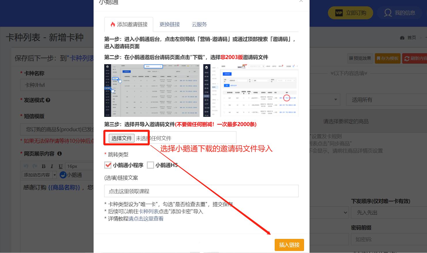 3、点击小鹅通之后会弹出框,将之前下载的小鹅通邀请码文件导入,然后点【插入链接】